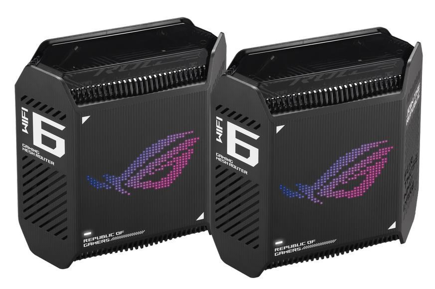 ROG Rapture Wifi 6 802.11ax Tri-band Gigabit Gaming Mesh System Wifi 6 802.11ax 574Mbps (2.4G) Wifi 6 802.11ax 4804Mbps (5GHz-1) Wifi 6 802.11ax 4804Mbps (5GHz-2) Data rate: 10000Mbps Whole home mesh wifi system for large and multi-story homes Supports flexible SSID setting, wired inter-router connections OFDMA + MU-MIMO tech, 1024 QAM, 2.5G WAN port, Triple level Game Acceleration, Aura RGB lighting, AiProtection Pro, VPN Fusion, Instand Guard Adaptive QoS, Bandwidth control, AiMesh, ASUS Roter APP (ROG theme).