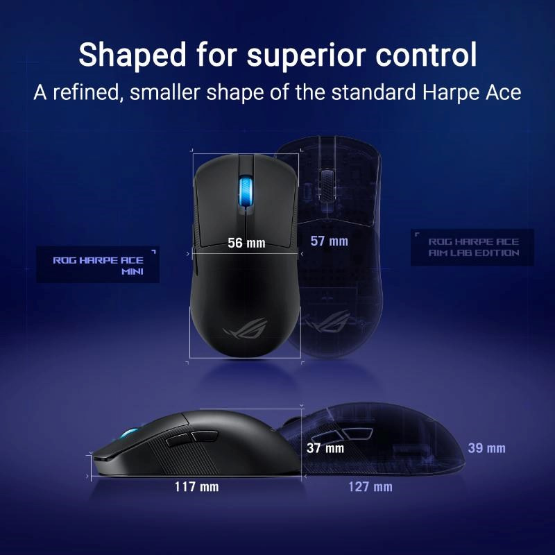 ROG Harpe Ace Mini je ultralehká 49-gramová polosymetrická herná myš s tvarom schváleným profesionálnymi hráčmi FPS. ROG Harpe Ace Mini je vybavená optickým senzorom ROG AimPoint Pro s rozlíšením 42 000 dpi a optickými mikroprevzorkačmi ROG a zobrazuje špičkový bezdrôtový výkon s bezdrôtovou technológiou SpeedNova a podporuje až 8 000 Hz bezdrôtovú rýchlosť dotazovania (kompatibilné s ROG Polling Rate Booster).