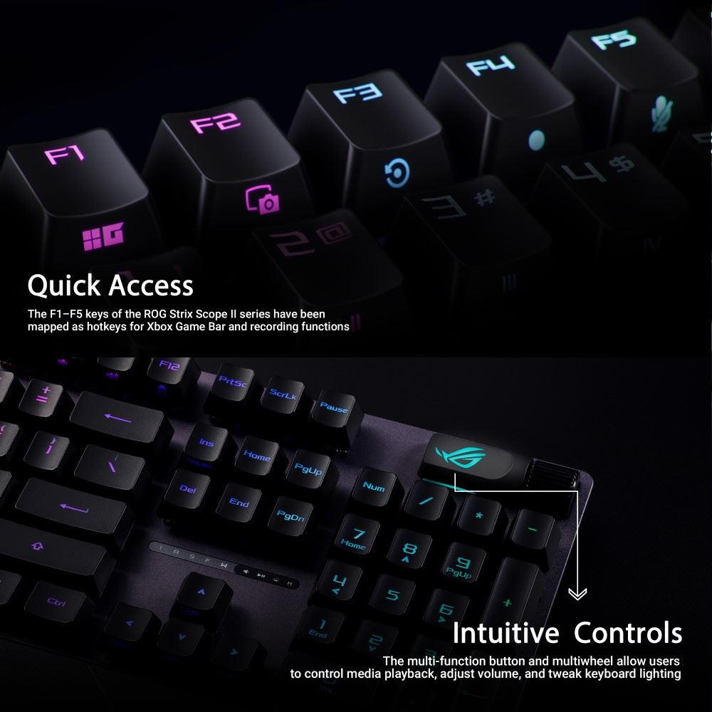 Herná klávesnica ROG Strix Scope II s predpripravenými mechanickými spínačmi ROG NX Red, penou na tlmenie hluku, dvojitými krytkami kláves PBT alebo ABS s UV povrchovou úpravou, klávesovými skratkami na streamovanie, multifunkčnými ovládacími prvkami, tromi uhlami sklonu a opierkou zápästia