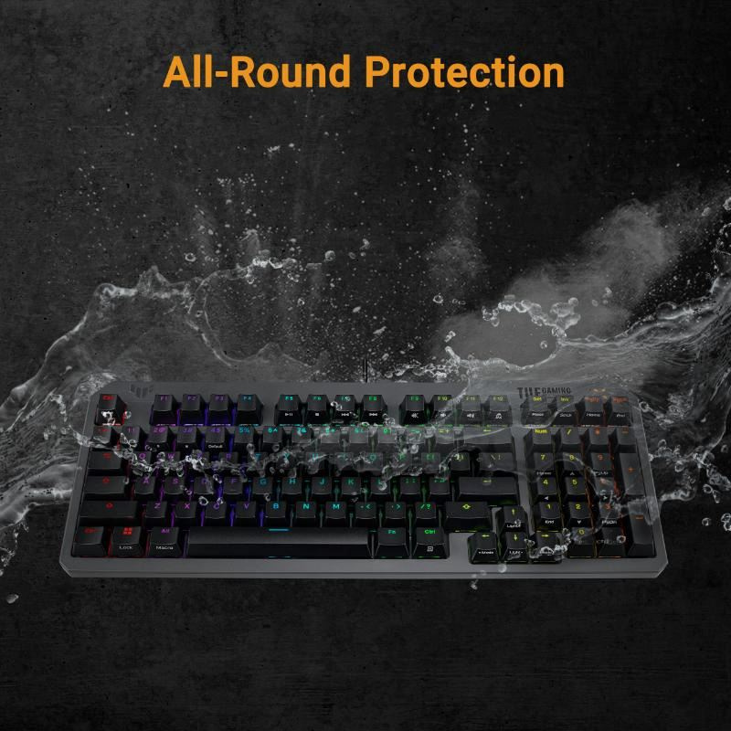 Klávesnica ASUS TUF Gaming K3 Gen II s kompaktným rozložením 97 kláves, opticko-mechanickými RGB prepínačmi, silikónovým tesnením, tlmiacou penou, vodotesnosťou IP57, odnímateľnou vrchnou doskou a kompatibilitou Aura Sync.