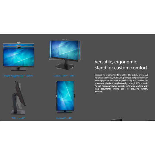 Monitor ASUS BE279QSK na videokonferencie - 27-palcový, Full HD, IPS, bezrámčekový, Full HD webová kamera, sústava mikrofónov, stereo reproduktory, nastaviteľná výška, ergonomický dizajn, HDMI, Eye Care, Low Blue Light, Flicker Free, možnosť montáže na stenu