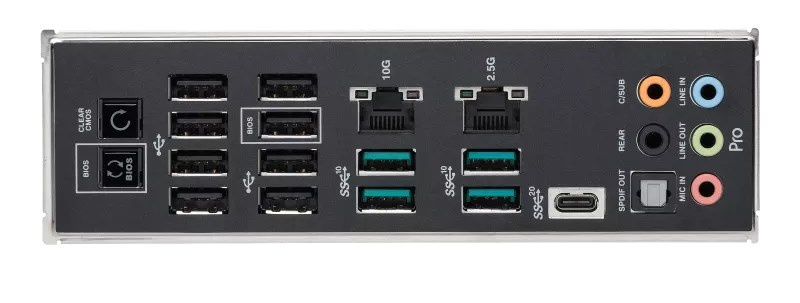 1 x USB 3.2 Gen 2x2 port(y) (1 x USB Type-C®) 4 x USB 3.2 Gen 2 port(y) (4 x Type-A) 8 x USB 2.0 port(y) (8 x Type-A) 1 x Marvell® AQtion 10Gb Ethernet port 1 x Intel® 2.5Gb Ethernet port 5 x zvukové redukcie 1 x optický S/PDIF výstup 1 x tlačidlo BIOS FlashBack™ 1 x tlačidlo na vymazanie CMOS