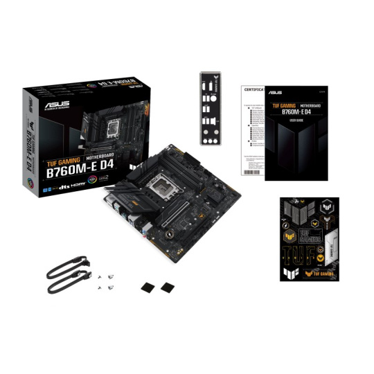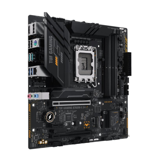 TUF GAMING B760M-E D4 takes all the essential elements of the latest Intel® processors and combines them with game-ready features and proven durability. Engineered with military-grade components, an upgraded power solution and a comprehensive cooling system, this motherboard goes beyond expectations with rock-solid performance for marathon gaming. TUF GAMING motherboards also undergo rigorous endurance testing to ensure that they can handle conditions where others may fail. Aesthetically, this model incorporates an embossed nameplate and geometric design elements to reflect the dependability and stability that defines the TUF GAMING series.