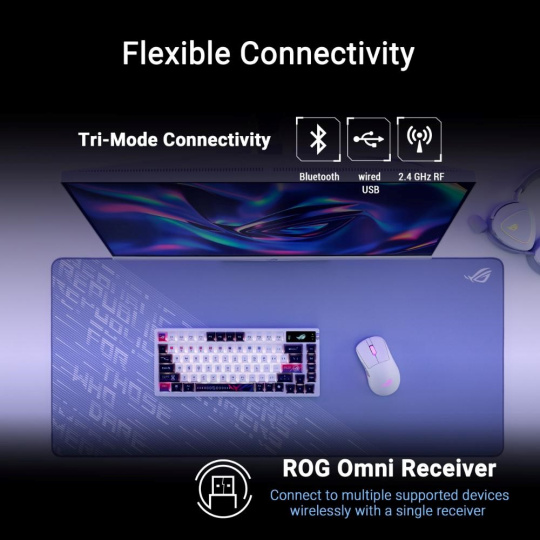 - Ultrarýchly bezdrôtový výkon: Všestranné možnosti pripojenia: 2,4GHz bezdrôtové RF, Bluetooth® a káblové USB; pribalený prijímač ROG Omni podporuje bezdrôtové pripojenie viacerých zariadení pomocou jediného prijímača