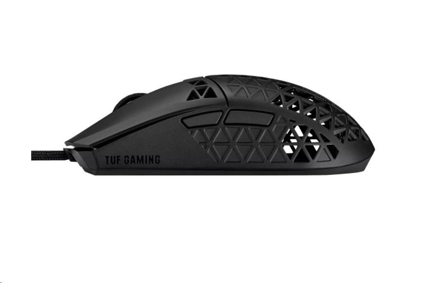 Ľahká drôtová herná myš so snímačom s rozlíšením 16 000 dpi, šiestimi programovateľnými tlačidlami, ultraľahkým plášťom Air Shell, odolnosťou voči vode IPX6, antibakteriálnou ochranou ASUS, šnúrkou TUF Gaming Paracord a čistými PTFE nožičkami