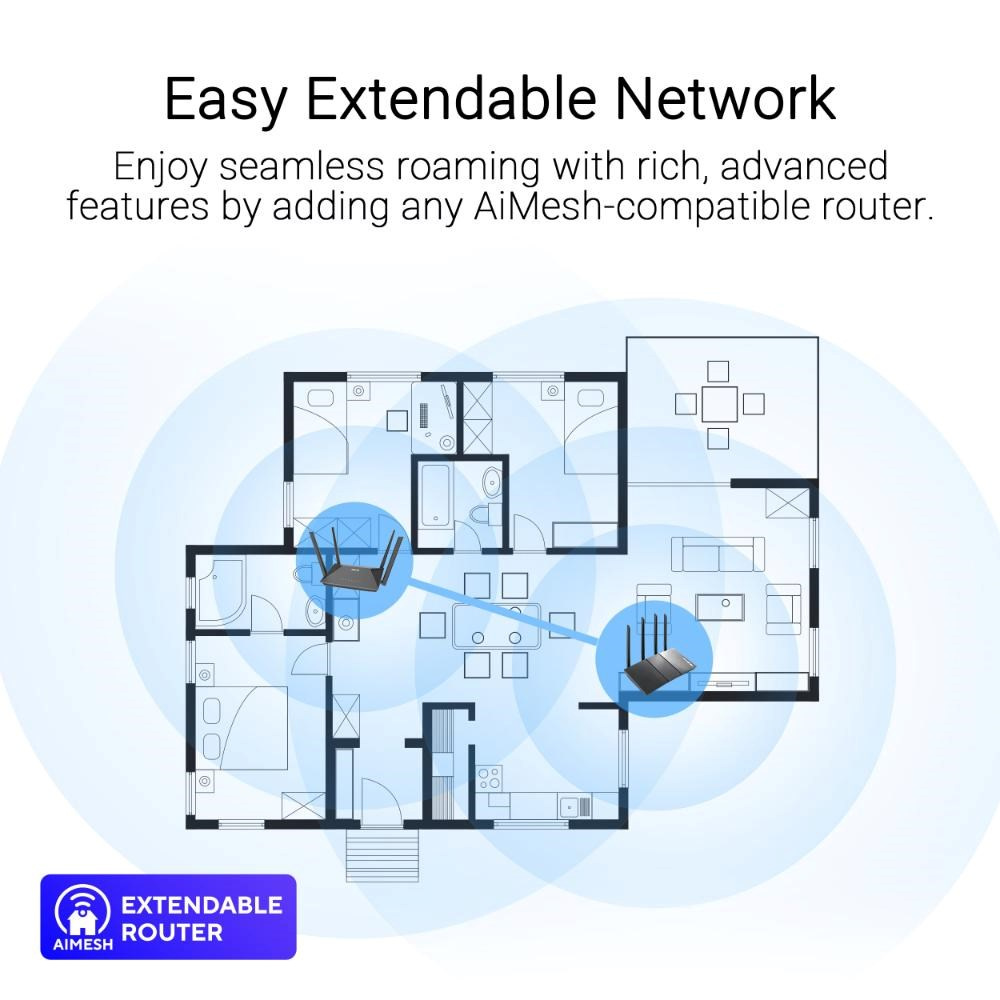 - Jednoducho rozšíriteľná sieť - Užite si bezproblémové roamingové funkcie s bohatými pokročilými funkciami pridaním akéhokoľvek routera kompatibilného s AiMesh.