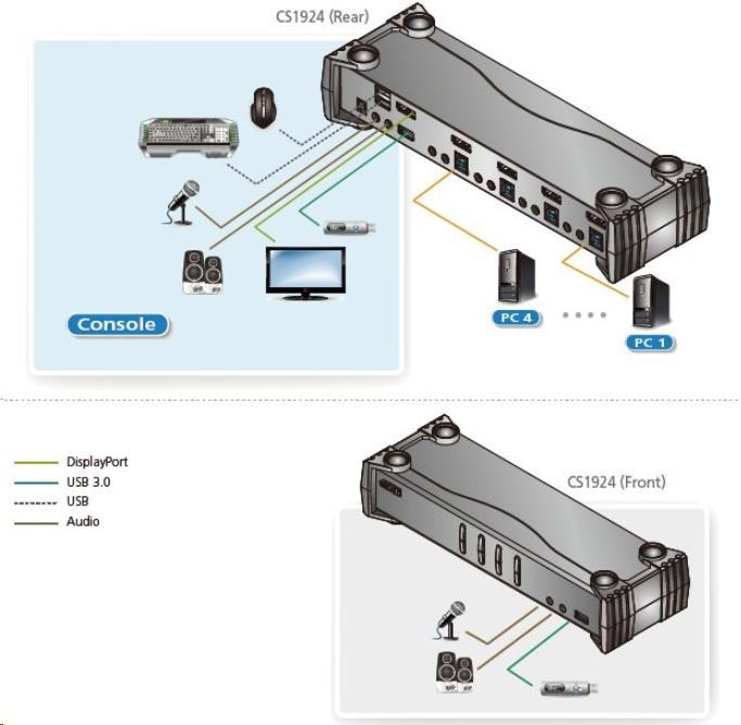 Prepínač je pripojený pomocou káblov DisplayPort, má integrovaný USB 3.0 2 portový HUB na pripojenie ďalších zdieľaných zariadení, podpora zvuku 2.1