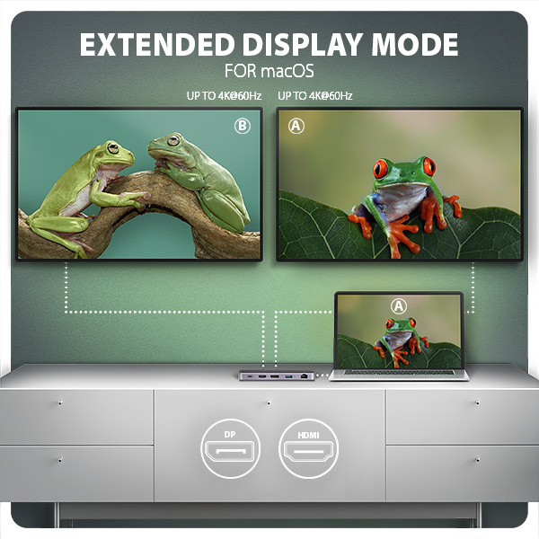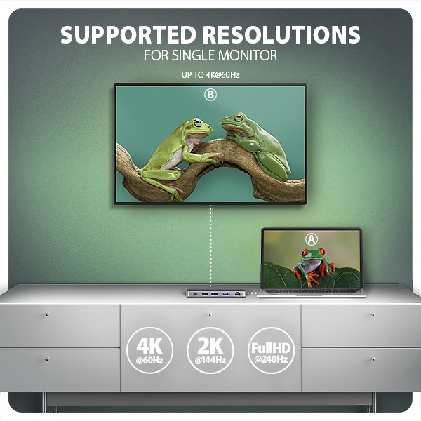 Výstupy HDMI a DisplayPort poskytujú kvalitný obraz. Či už sa používajú samostatne alebo súčasne, porty ponúkajú rozlíšenie až 4K/60Hz Ultra HD a podporujú viackanálový prenos zvuku. Vysoké frekvencie sú podporované aj v populárnych herných rozlíšeniach 2K/144Hz alebo FullHD/240Hz. Vďaka podpore HDR (High Dynamic Range) si môžete vychutnať výrazne rozšírenú škálu farieb a kontrastov bez obmedzení. Aby video výstupy fungovali správne, musí mať prenosný počítač port USB-C s podporou alternatívneho režimu DisplayPort (DP Alt Mode) alebo port Thunderbolt 3 a vyšší.