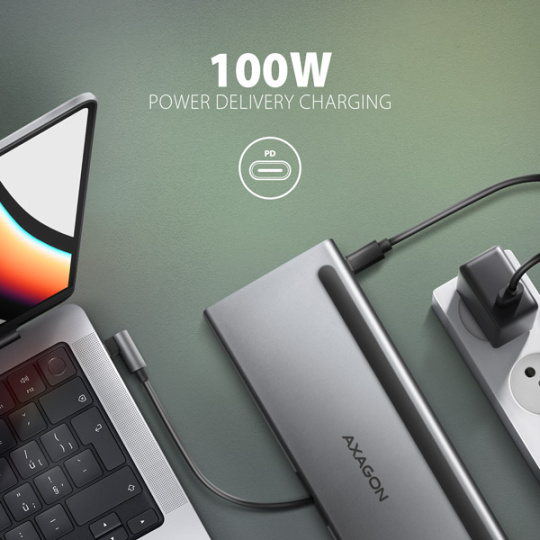 AXAGON HMC-4KX3 USB 5Gbps hub, 3x USB-A, 2x HDMI, DP, RJ-45 GLAN, SD/microSD, audio, PD 100W, kábel USB-C 40cm