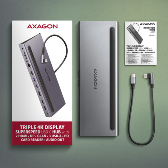 Multiportový USB-C 5Gbps TRIPLE 4K DISPLAY hub AXAGON HMC-4KX3 rozšíri váš notebook o deväť portov a čítačku pamäťových kariet SD/microSD. Prostredníctvom obojstranného USB-C konektora môžete k počítaču jednoducho a rýchlo pripojiť až tri monitory, tri USB zariadenia, gigabitovú ethernetovú sieť, slúchadlá a čítačku kariet . Zároveň získate možnosť napájania notebooku pomocou technológie Power Delivery. USB-C hub tak bude fungovať ako univerzálna a výkonná dokovacia stanica 11 v 1 pre moderné notebooky.