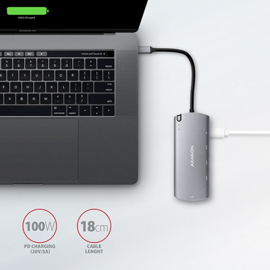 Viacportové USB-C 3.rozbočovač AXAGON HMC-6M2 COMBO 6v1 2 Gen 1 rozšíri váš notebook, počítač alebo telefón o štyri porty a externý box pre M.2 pohon. Ľahko a rýchlo pripojte dve zariadenia USB, gigabitovú sieť Ethernet, displej HDMI a SATA Mk počítaču prostredníctvom obojstranného konektora USB-C.2 jednotky SSD súčasne. Zároveň máte možnosť napájať notebook pomocou technológie Power Delivery. Rozbočovač USB-C vám poskytne jednoduchú a kompaktnú dokovaciu stanicu 6 v 1 pre notebook, napríklad MacBook Pro.