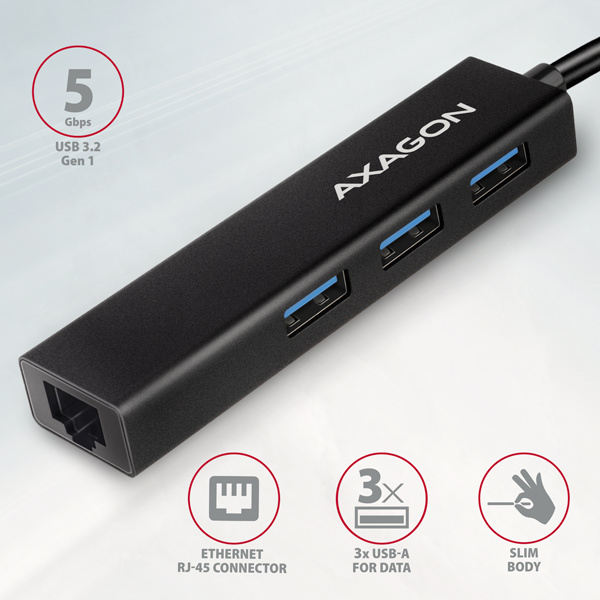 tenký kovový USB-C 3.2 Gen 1 (USB 3.0) Viacportový rozbočovač AXAGON HMC-GL3A nielenže pripojí až tri zariadenia USB súčasne k vášmu notebooku alebo počítaču, ale pridá aj gigabitovú sieťovú kartu na pripojenie počítača k vysokorýchlostnej sieti. Kovové telo rozbočovača je vyrobené z hliníka a poskytuje dokonalú mechanickú ochranu pri častom prenášaní. Elegantný, jemne štruktúrovaný povrch zabraňuje nechceným odtlačkom prstov. 20 cm dlhý pevný kábel USB je ideálny pre používateľov mobilných zariadení.