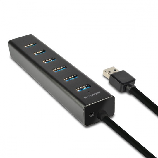 7-portový USB 3.0 hub AXAGON HUE-SA7BP ALU CHARGING s vlastným zdrojom napájania a podporou rýchleho nabíjania na všetkých portoch USB. Kompaktný rozbočovač s odolným hliníkovým puzdrom pripojí k počítaču až sedem zariadení USB súčasne. Pevný USB kábel s dostatočnou dĺžkou 40 cm ideálny na použitie s notebookmi.