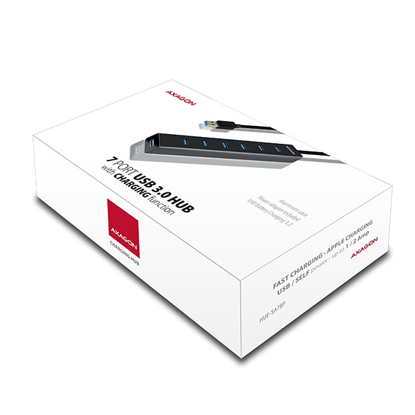 AXAGON HUE-SA7BP, 7x USB 3.0 ALU CHARGING hub, vr. AC adaptéra, kábel USB-A 40cm
