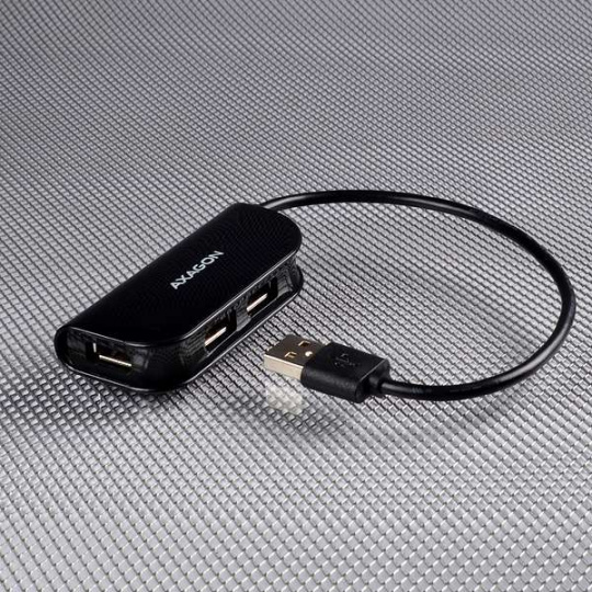 Štyri porty USB 2.0 READY hub AXAGO HUE-X4B s pevným káblom USB.