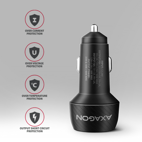 AXAGON PWC-PQ48, ładowarka samochodowa 48 W, wyjścia USB-A + USB-C, PD3.0/PPS/QC4+/SFC/Apple