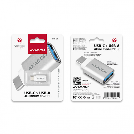 AXAGON RUCM-AFA, redukcia USB-C (M) -> USB-A (F), USB 3.2 Gen 2, 3A, ALU