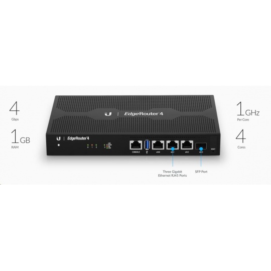 edgeRouter 4 je vhodný všade tam, kde je potrebné smerovať veľké množstvo dát, v malých a stredných podnikoch a všade tam, kde je prioritou bezpečnosť siete. EdgeRouter je vybavený celkovo 3x Gbit Ethernet porty, 1x SFP, dostatočne veľkou 1GB DDR3 pamäťou, 4GB úložným priestorom a 1x USB 3.0. Celú prevádzku riadi štvorjadrový procesor MIPS64 s taktom až 1 GHz a hardvérovou akceleráciou na spracovanie paketov. EdgeRouter ponúka všetky základné funkcie, ktoré od smerovača očakávate.