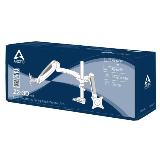 The ARCTIC Z2-3D (Gen 3) monitor arm supports the latest ultrawide monitors (up to 29 inches) with ease. Classic 16:9 monitors are also compatible (up to 34 inches). The Z2-3D (Gen 3) supports monitors with 8 kg/17.6 lbs per arm.