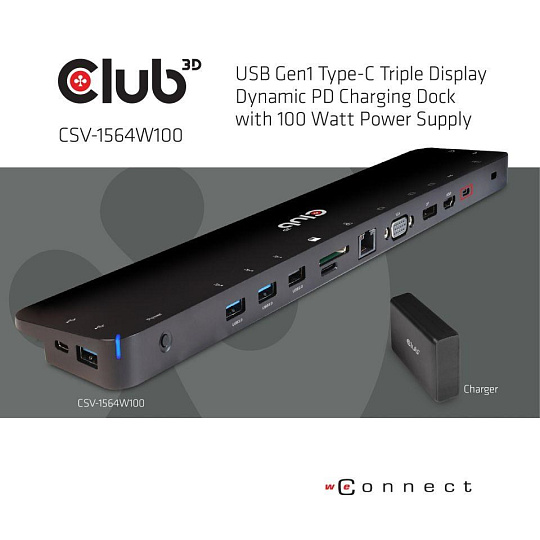 CSV-1564W100 - Club-3D USB 3.2 Gen1 C Triple Display Dynamic PD Charging Dock je integrované riešenie kombinujúce video, dáta, napájanie, ethernet a zvuk, ktoré je určené najmä pre často cestujúcich. Tri rôzne video porty (HDMI™, DisplayPort™, VGA) vám umožňujú vychutnať si 3 rôzne obrázky alebo videá na 3 rôznych displejoch súčasne v režime MST. Porty USB typu A a dátový port USB typu C umožňujú pripojiť k hostiteľovi viacero zariadení USB. Nabíjací port USB typu C vám umožňuje zabezpečiť napájanie tohto doku a zároveň nabíjať hostiteľský počítač pripojením napájacieho adaptéra PD, takže nemusíte nosiť so sebou napájací zdroj notebooku.