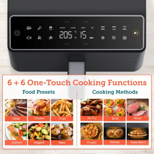 S horkovzdušnou frytzou COSORI CAF-P583S SMART si môžete vychutnať vaše obľúbené vyprážané jedlá bez výčitiek, pretože na rozdiel od bežného vyprážania alebo fritovania je v tejto horkovzdušnej frytze možné pripravovať jedlá s použitím veľmi malého množstva oleja alebo vôbec žiadneho. Patentovaná technológia THERMO IQ 360° HEAT CIRCULATION presne reguluje teplotu inteligentným teplotným algoritmom a zabezpečuje tak rovnomerne uvarené jedlo bez nutnosti jeho pretrepávania alebo prevrátenia. Kombinácia cirkulujúceho horúceho vzduchu, dokonalé teploty varenia a chytrých programov zaistí, že hranolky budú vždy krásne chrumkavé a kuracie stehná šťavnaté. Programy si môžete rýchlo a pohodlne nastaviť tiež cez smartphone alebo Amazon Alexa a Google Assistant. Keď budete mať hotovo, čistenie bude rovnako jednoduché vďaka nepremastiteľnému košu, ktorý je možné umývať v umývačke riadu. Vďaka veľkej nádobe s objemom 6,4l môžete rýchlo navariť aj pre väčšiu rodinu alebo skupinu hostí.