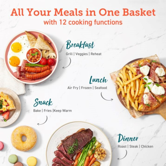 Nechajte horkovzdušnú frytzu robiť prácu za vás s funkciami varenia jedným dotykom, ako je vyprážanie horúcim vzduchom, pečenie, grilovanie, opekanie, ohrev, kuracie mäso, steak, morské plody, zelenina, hranolky, mrazené a udržiavanie jedla v teple. Objavujte ďalšie možnosti prispôsobením vlastných funkcií varenia s preferovaným časom a teplotou.