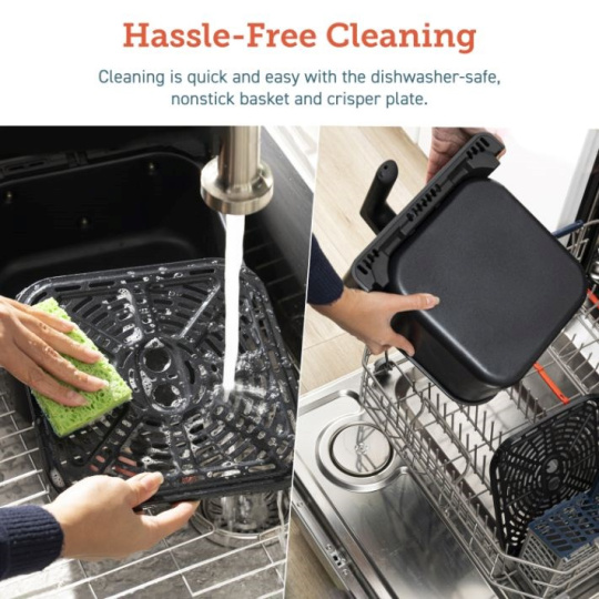 Vyberateľný fritovací kôš a nádoba sú vyrobené z odolného, nepremastiteľného a zdravotne nezávadného materiálu (BPA a BFOA FREE) a je možné ich umývať v umývačke riadu. Vždy chladná rukoväť a tlačidlo na uvoľnenie koša eliminujú riziko popálenia a nechtiac uvoľnenia.