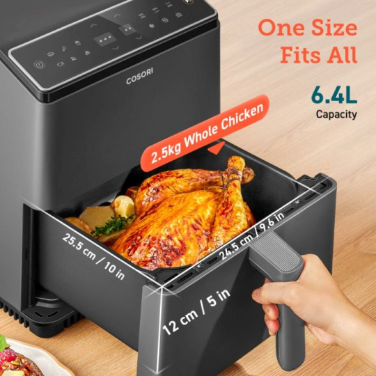 Horkovzdušná fryzta COSORI CAF-P583S sa pýši obrovským objemom koša 6.4 litra s praktickým štvorcovým tvarom, vďaka čomu vyhovie aj väčším domácnostiam. S výkonom 1700 W je fryza mimoriadne výkonná, čím sa skracuje doba varenia a šetrí sa elektrická energia. Vďaka veľkosti varného priestoru môžete pripraviť aj celé 3,5 kg kura naraz alebo 17 kuracích krídel, ktoré sa do kruhového koša alebo objemu 3-4l ťažko vmestia.