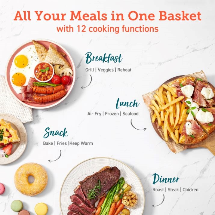 Nechajte horkovzdušnú frytzu robiť prácu za vás s funkciami varenia jedným dotykom, ako je vyprážanie horúcim vzduchom, pečenie, grilovanie, opekanie, ohrev, kuracie mäso, steak, morské plody, zelenina, hranolky, mrazené a udržiavanie jedla v teple. Objavujte ďalšie možnosti prispôsobením vlastných funkcií varenia s preferovaným časom a teplotou.