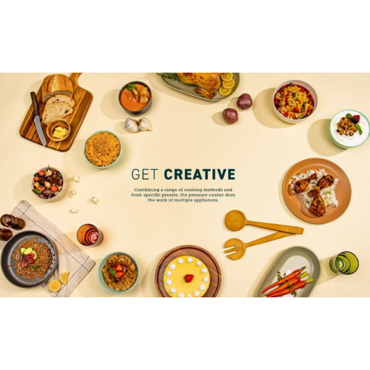 - Tlakové varenie, ryža, para, ovsené vločky/kaša, dusené mäso/vývar, fazule/zrno, mäso/drutí, jogurt, koláč, pomalé varenie, soté, Sous Vide, udržovanie teploty