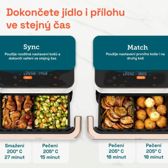 Fritéza má dômyselnú funkciu Sync. Ak rozdelíte kôš na dve časti a chcete pripraviť dve rôzne jedlá, stlačením tlačidla Sync synchronizujete prípravu a ukončíte ju v rovnakom čase. Hotový vedľajší pokrm sa nevysuší, kým čakáte na prípravu hlavného jedla. Funkcia Match vám potom umožní rýchlo nastaviť rovnaký program v oboch košoch bez toho, aby ste museli robiť to isté dvakrát.