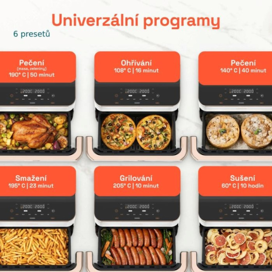 Vďaka šiestim programom dokáže Cosori TwinFry piecť, smažiť, grilovať, piecť sladké a slané pokrmy a dokonca aj sušiť. Nezáleží na tom, či potrebujete celý 10l kôš alebo len jeho polovicu. Rozdelením koša môže fritéza pripravovať dva nezávislé pokrmy, čo je užitočné najmä pri príprave jedla a prílohy súčasne. Ovládanie je také pohodlné a intuitívne, že sa varenie stane otázkou niekoľkých dotykov, a nie celodenného postávania pri kuchynskej linke.