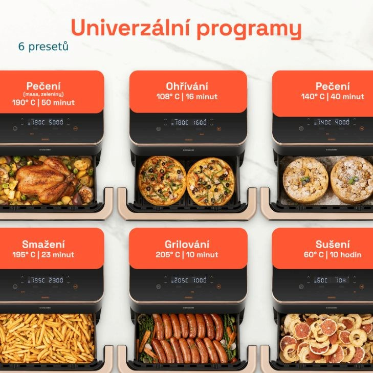 Vďaka šiestim programom dokáže Cosori TwinFry piecť, smažiť, grilovať, piecť sladké a slané pokrmy a dokonca aj sušiť. Nezáleží na tom, či potrebujete celý 10l kôš alebo len jeho polovicu. Rozdelením koša môže fritéza pripravovať dva nezávislé pokrmy, čo je užitočné najmä pri príprave jedla a prílohy súčasne. Ovládanie je také pohodlné a intuitívne, že sa varenie stane otázkou niekoľkých dotykov, a nie celodenného postávania pri kuchynskej linke.