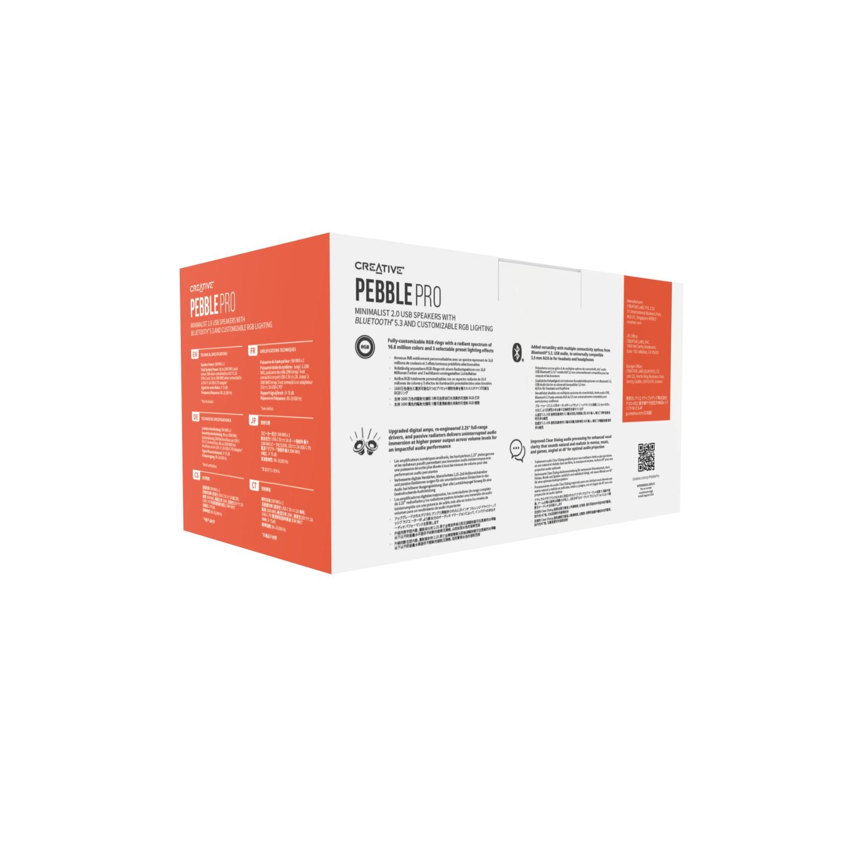 Kompaktné reproduktory Pebble Pro, ktoré si zachovávajú svoj charakteristický 45° zvýšený uhol, aby smerovali zvuk priamo k vašim ušiam a poskytli vám pohlcujúci zážitok z počúvania, dosahujú akustický výkon až 10 W RMS a špičkový výkon až 20 W pri pripojení cez USB-C. Ak chcete zvuk ešte viac zosilniť, môžete reproduktory Creative Pebble Pro pripojiť ku 30W adaptér USB PD (nie je súčasťou balenia) a vychutnať si ohromujúci akustický výkon až 30 W RMS a 60 W v špičke.