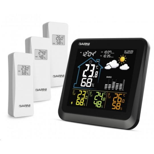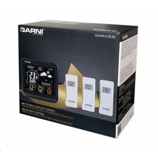 Meteorologická stanica s 3 bezdrôtovými snímačmi na meranie vonkajšej teploty a relatívnej vlhkosti, špičkovým inverzným farebným VA displejom s časom a dátumom riadeným rádiovým signálom DCF-77, budíkom, grafom, meraním vnútornej teploty, relatívnej vlhkosti a absolútneho a relatívneho barometrického tlaku. Zobrazenie všetkých meraných hodnôt na displeji súčasne. špičkový inverzný farebný VA displej o rozmeroch 106 x 94 mm s možnosťou stályho osvetlenia pri napájaní sieťovým adaptér, alebo krátkodobým osvetlením na 10 s pri napájaní batériami tri stupne jasu osvetlenia displeja (pri napájaní sieťovým adaptér) a možnosť vypnutia osvetlenia displeja veľkosť číslic na displeji – čas, dátum 7 mm, vnútorná teplota 21 mm, vnútorná relatívna vlhkosť 14 mm, vonkajšia teplota 12,5 mm, vonkajšia relatívna vlhkosť 10 mm, barometrický tlak 4,5 mm farbenie na displeji: čas, barometrický tlak, vnútorná teplota a rel. vlhkosť, graf biela, teplota a rel. vlhkosť na kanáli č.1 žltá, na kanáli č.2 zelená a na kanáli č.3 oranžová čas a dátum riadené signálom DCF-77 s možnosťou manuálneho nastavenia ikona príjmu signálu DCF-77 12-hodinový alebo 24-hodinový formát zobrazenia času možnosť nastavenia časového pásma od -12 do +12 hodín budík s funkciou opakovaného budenia (Snooze) po 5 minútach budící signál - 10 sekúnd 1 pípnutie za sekundu, 10 sekúnd 2 pípnutia za sekundu, 10 sekúnd 4 pípnutia za sekundu a následne stály pípajúci zvuk 5 ikon predpovede počasia (jasno, polojasno, oblačno, zrážky (dážď), zrážky (sneženie) na základe sledovania barometrického tlaku vestaveným barometrom možnosť nastavenia východiskovej ikony predpovede počasia zobrazenie hodnôt vnútorného a vonkajšieho tepla a relatívnej vlhkosti zo všetkých 3 snímačov súčasne zobrazenie teploty vo °C alebo °F zobrazenie barometrického tlaku absolutného a relatívneho (hPa/mb alebo mmHg) možnosť nastavenia hodnoty relatívneho barometrického tlaku graf vývoja bar. tlaku, vnútorné a vonkajšie teploty na všetkých troch kanáloch za uplynulých 12 hodín pamäť na maximálne a minimálne namerané hodnoty teploty a relatívnej vlhkosti 3 ikony vnútorného tepelného pohodlia 3 bezdrôtové snímače GARNI 052H sú súčasťou balenia bezdrôtový prenos hodnôt vonkajšej teploty a relatívnej vlhkosti na frekvencii 433 MHz ikona slabých batérií hlavnej jednotky a vonkajších snímačov napájanie hlavnej jednotky sieťovým adaptérom alebo batériami dĺžka kábla sieťového adaptéra 1,80 m možnosť postaviť, alebo zavesiť farba čierna Bezdrôtové snímač GARNI 052H odolné voči vlhkosti displej o rozmeroch 25 x 12 mm veľkosť číslic na displeji: teplota 7 mm a relatívna vlhkosť 6 mm meranie teploty a relatívnej vlhkosti 3 kanály maximálny RF výkon 10 dBm (10 mW) možnosť postaviť, alebo zavesiť farba biela Obsah balenia: 1 x hlavná jednotka GARNI 502 3 x bezdrôtové snímače GARNI 052H 1 x sieťový adaptér český, slovenský, nemecký, anglický, poľský, maďarský a holandský návod