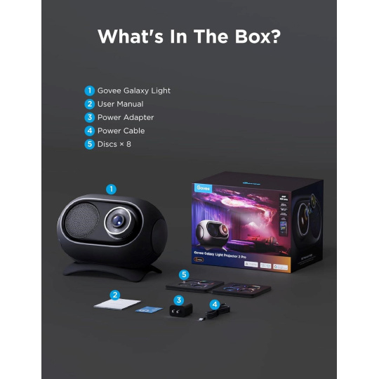 Súčasťou balenia je osem unikátnych diskov s rôznymi galaktickými motívmi, ktoré možno ľahko a rýchlo meniť. Každý disk prináša odlišnú atmosféru, od mliečnej dráhy až po realistickú nočnú oblohu. Vďaka jednoduchému mechanizmu výmeny môžete okamžite premeniť svoj priestor.