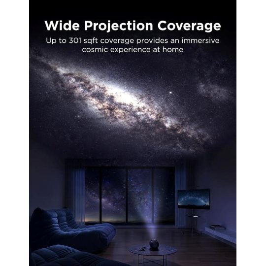 S uhlom projekcie 90° a plochou až 28 m2 vytvorí projektor naozaj pohlcujúce prostredie. Hviezdna obloha zaplní celú miestnosť a vy si tak užijete pocit, že sa nachádzate priamo pod otvorenou oblohou. Táto vlastnosť robí projektor ideálnym pre spálne, obývačky aj detské kútiky.