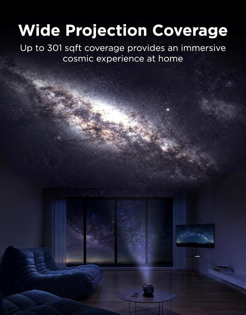 S uhlom projekcie 90° a plochou až 28 m2 vytvorí projektor naozaj pohlcujúce prostredie. Hviezdna obloha zaplní celú miestnosť a vy si tak užijete pocit, že sa nachádzate priamo pod otvorenou oblohou. Táto vlastnosť robí projektor ideálnym pre spálne, obývačky aj detské kútiky.