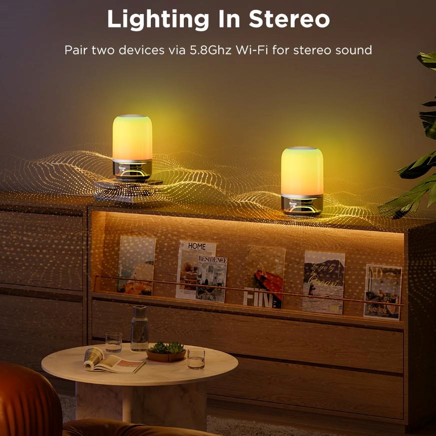 Podpora stereo párovania vám umožňuje pripojiť dve lampy pre priestranný, hlboký a úplne pohlcujúci zvuk. Hudba znie tak realisticky ako v profesionálnom štúdiu. Ideálne pre filmy, hry alebo párty.