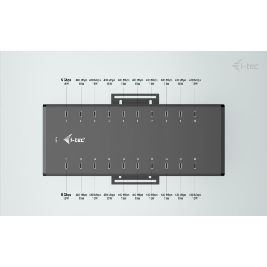 Tento moderný HUB ponúka 20 USB-C s funkciou Plug & Play a nabíjaním až 15 W na port. Vďaka tomu, že HUB má 20 USB portov, je možné nabíjať až 20 zariadení naraz.