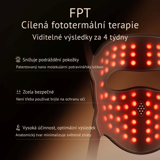 - Účinná domáca terapia – až 6-krát účinnejšia ako bežné LED masky. Patentovaná cielená fototermálna technológia koncentruje svetelnú energiu na presný bod a pôsobí priamo na hlboké vrstvy pokožky.