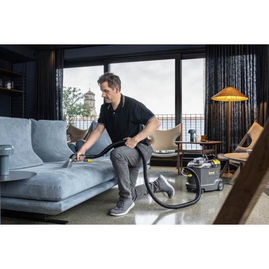 Robustný, odolný, účinný: Sprejový extrakčný čistič Puzzi 8/1 pôsobivo čistí čalúnenie a odstraňuje škvrny z textilných povrchov s vynikajúcimi a hygienickými výsledkami čistenia a vysokou účinnosťou. Kompaktny sprejový extrakčný stroj nastrekuje čistiaci roztok hlboko do textilných vlákien a potom ho opäť odstraňuje s uvoľnenými nečistotami. Tento vynikajúci výkon spätného satie tiež zabezpečuje rýchle uschnutie a znamená, že textilné povrchy možno rýchlo opätovne použiť – ideálne pre vysoké nároky profesionálov v oblasti upratovania v hotelových a pohostinských segmentoch alebo pri čistení interiérov vozidiel. Je možné použiť aj štandardnú extra krátku hubicu na čalúnenie pre pohodlné a ergonomické čistenie úzkych priestorov. Vďaka veľmi nízkej hmotnosti a ergonomickej rukoväti je sprejový extrakčný čistič ľahko prenášateľný jednou rukou. Pohodlie pre používateľa zvyšujú aj veľké tlačidlá, ktoré je možné ovládať rukou alebo nohou. Kryt prístroja a ručná tryska sú priehľadné pre ľahší pohľad na špinavú vodu.