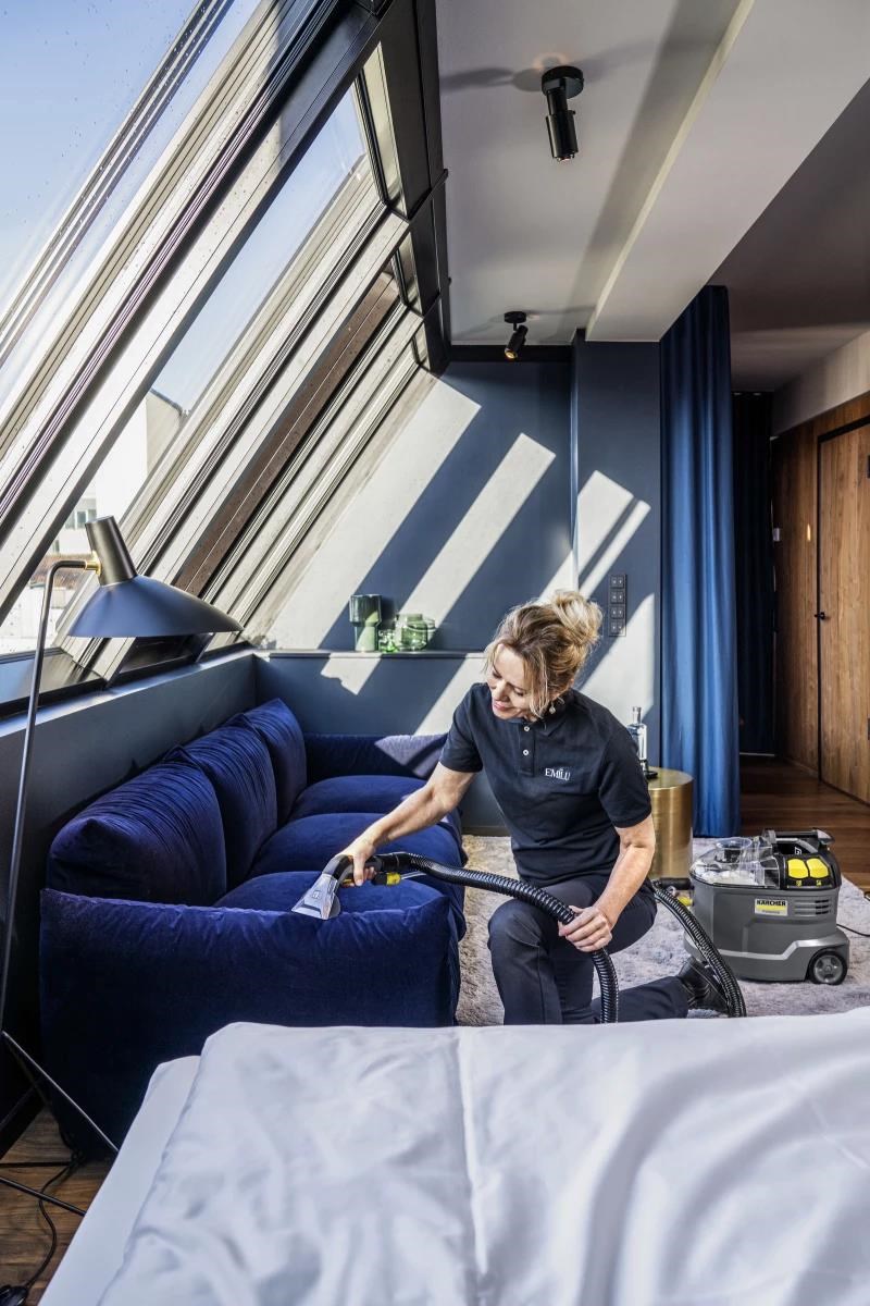 Robustný, odolný, účinný: Sprejový extrakčný čistič Puzzi 8/1 pôsobivo čistí čalúnenie a odstraňuje škvrny z textilných povrchov s vynikajúcimi a hygienickými výsledkami čistenia a vysokou účinnosťou. Kompaktny sprejový extrakčný stroj nastrekuje čistiaci roztok hlboko do textilných vlákien a potom ho opäť odstraňuje s uvoľnenými nečistotami. Tento vynikajúci výkon spätného satie tiež zabezpečuje rýchle uschnutie a znamená, že textilné povrchy možno rýchlo opätovne použiť – ideálne pre vysoké nároky profesionálov v oblasti upratovania v hotelových a pohostinských segmentoch alebo pri čistení interiérov vozidiel. Je možné použiť aj štandardnú extra krátku hubicu na čalúnenie pre pohodlné a ergonomické čistenie úzkych priestorov. Vďaka veľmi nízkej hmotnosti a ergonomickej rukoväti je sprejový extrakčný čistič ľahko prenášateľný jednou rukou. Pohodlie pre používateľa zvyšujú aj veľké tlačidlá, ktoré je možné ovládať rukou alebo nohou. Kryt prístroja a ručná tryska sú priehľadné pre ľahší pohľad na špinavú vodu.