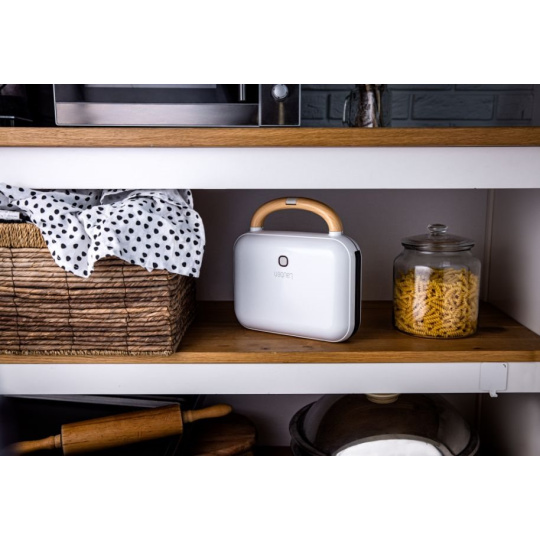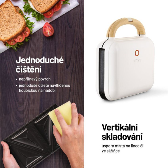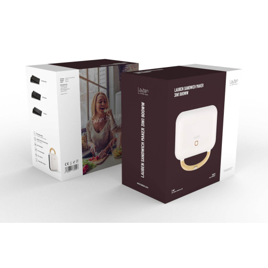 Chrumkavá raňajky, desiata aj rýchla večeraNemáte práve čas na prípravu teplej večere alebo vydatnej raňajky? S toastovačom Lauben zvládnete oboje za pár minút. Klasickými toasty so šunkou a syrom potešíte každé dieťa, určite však u nich nemusíte skončiť. Sendvičovač Lauben si vďaka 3 sadám plotienok poradí aj s raňajkovou vafľou alebo grilovaním mäsa. Nahrejete ho počas chvíľky a jedlo budete mať hotové skôr, než stihnete všetkých zavolať ku stolu. Teší vás aj ľahká údržba a uloženie. Sendvičovač vertikálne uložíte do kuchynskej skrinky a výmeniteľné plotýnky môžete jednoducho utrieť hladkou stranou hubky na riad. Vďaka integrovaným protisklzovým nôžkam ostane počas prípravy jedla na mieste. Mysleli sme aj na bezpečný prevádzku. Cool Touch držadlo zabezpečí, že sa nikdy nespálite a prevádzku indikuje LED kontrolka na povrchu prístroja. Pridanou hodnotou je prémiový dizajn značky Lauben. Trendy off white prevedenie s dreveným dekorom sa totiž skvele hodí do každej kuchyne.