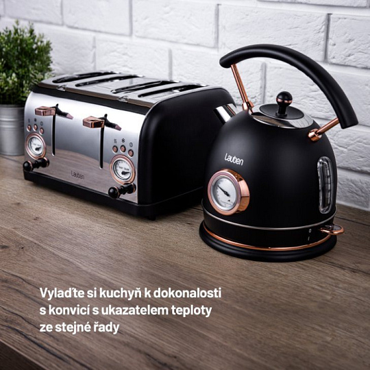 Dokonalou dvojici tvoří topinkovač s rychlovarnou konvicí Lauben Kettle 17BC s ukazatelem teploty ve stejném designu.