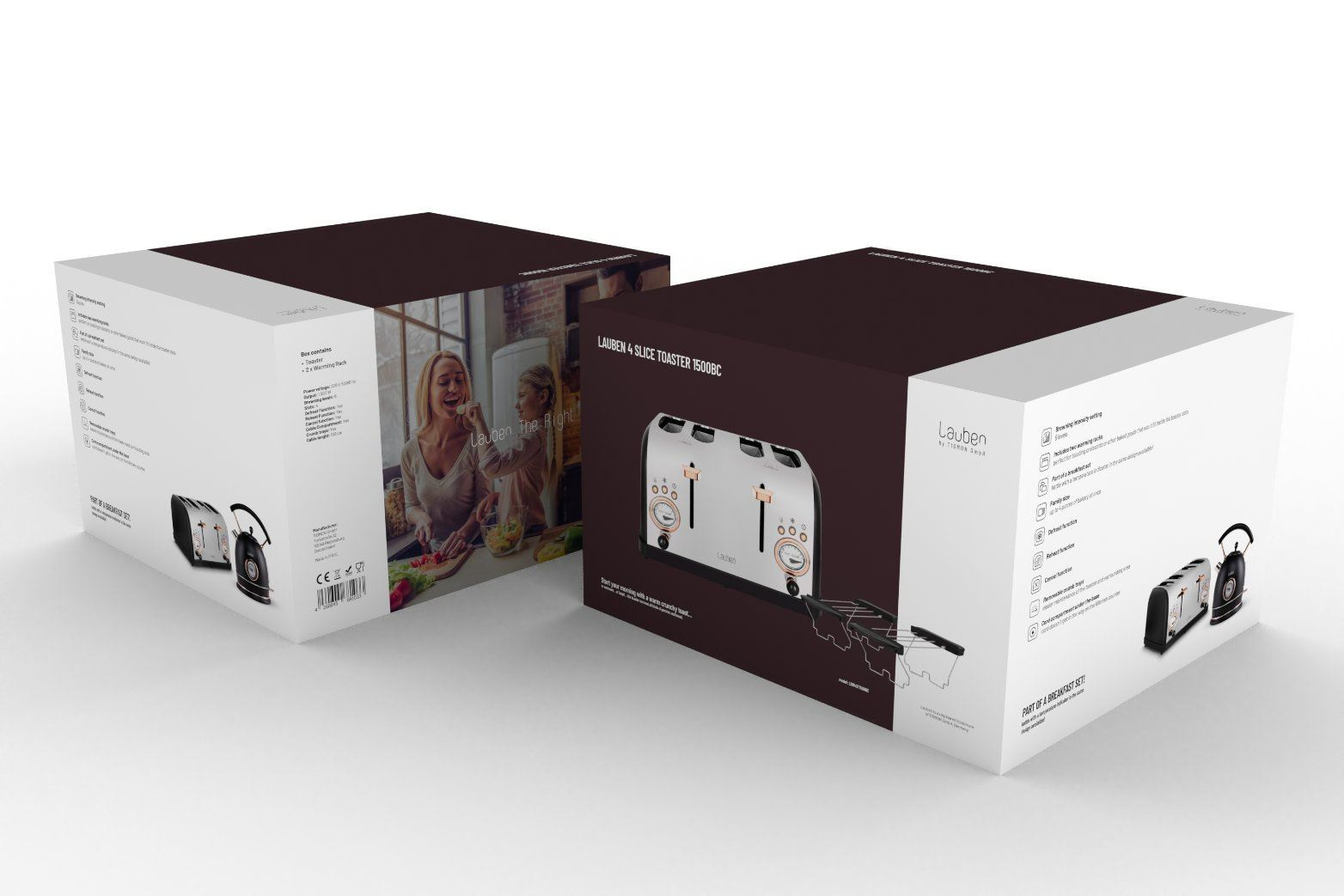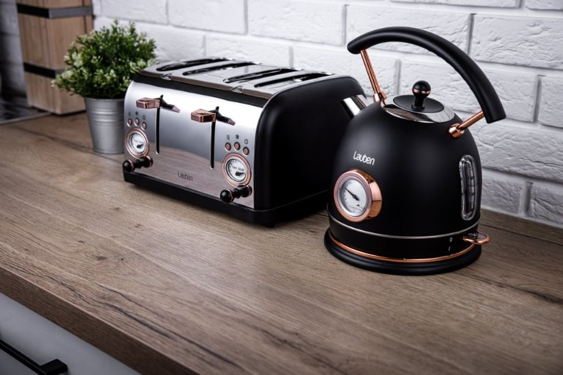 Dokonalou dvojici tvoří topinkovač s rychlovarnou konvicí Lauben Kettle 17BC s ukazatelem teploty ve stejném designu.