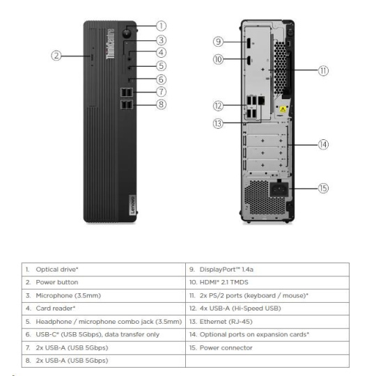 | Predné porty | 1x USB-C® (USB 5Gbps / USB 3.2 Gen 1), with 15W charging 4x USB-A (USB 5Gbps / USB 3.2 Gen 1) 1x headphone / microphone combo jack (3.5mm) 1x microphone (3.5mm) |