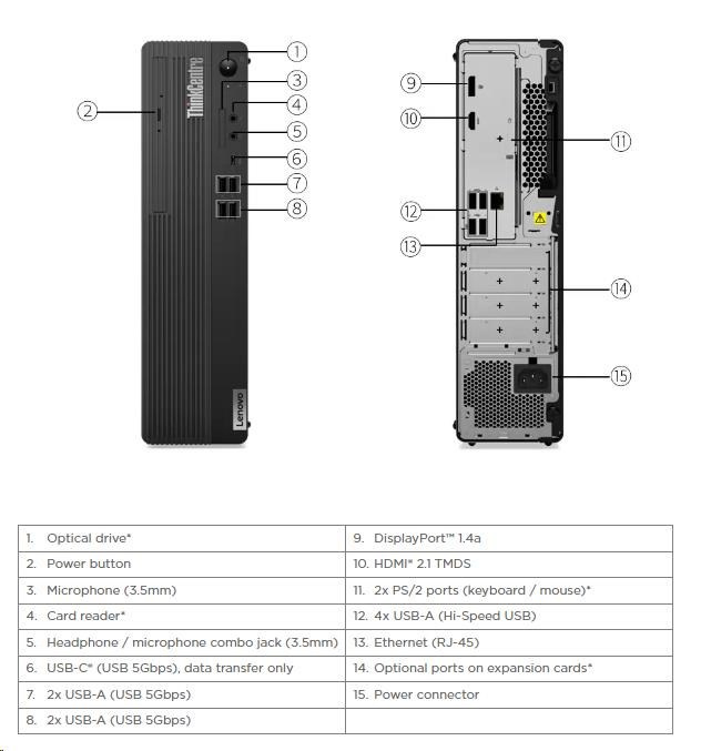 | Predné porty | 1x USB-C® (USB 5Gbps / USB 3.2 Gen 1), with 15W charging 4x USB-A (USB 5Gbps / USB 3.2 Gen 1) 1x headphone / microphone combo jack (3.5mm) 1x microphone (3.5mm) |
