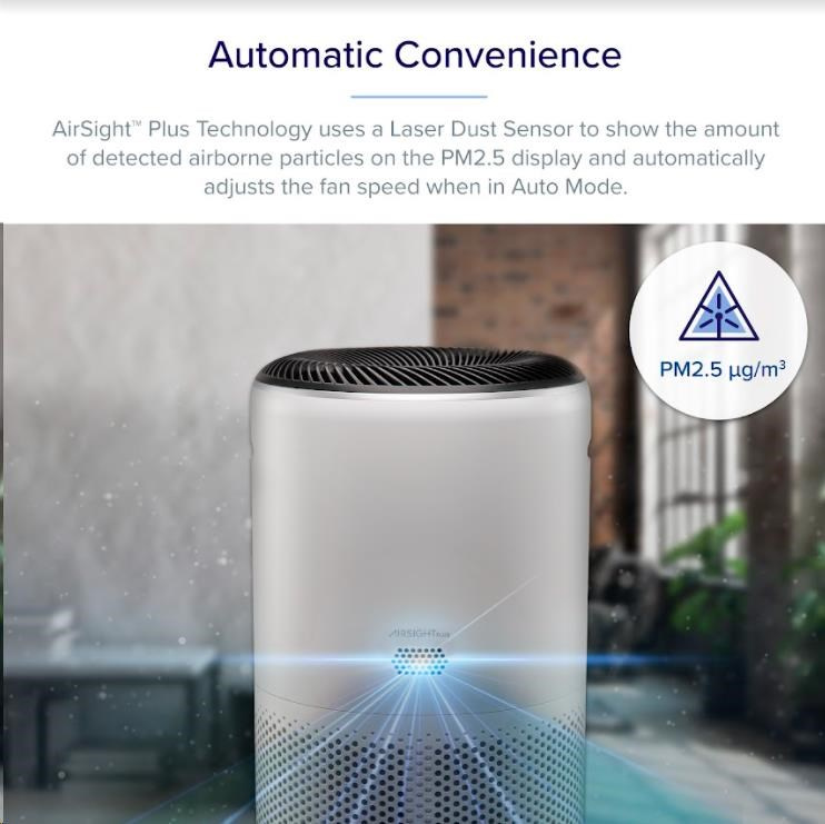 Technológia AirSightTM PLUS je postavená na skenovaní kvality vzduchu špeciálnym prachovým laserovým senzorom. Ten je schopný zaznamenať znečistenie časticami až 3x menšími ako bežne používané infračervené senzory.