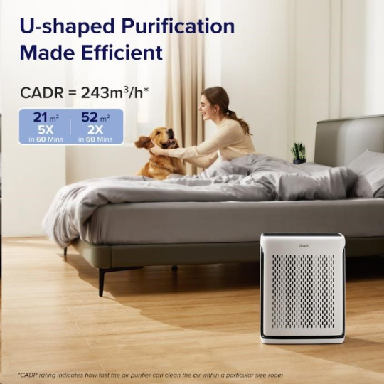 Levoit Vital 100S disponuje výkonom až 243 m3/h CAD a vyčistí dvakrát za hodinu miestnosť o veľkosti až 52 m2 a až päťkrát za hodinu miestnosť o veľkosti 21 m2.